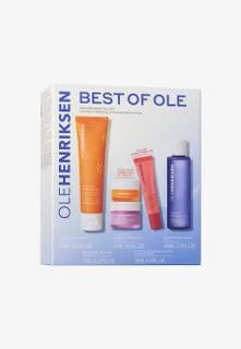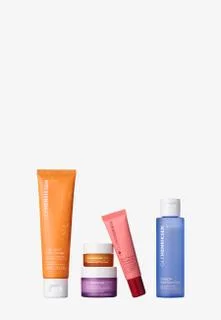 This daily skincare routine features five bestselling products from OleHenriksen for smooth, even-looking, hydrated, and elastic skin. Truth Juice Daily Cleanser removes dirt, excess oil, and long-wear makeup while revitalizing the skin. Glow2OH Toner visibly reduces dark spots. Strength Trainer Peptide Boost Moisturizer strengthens the skin's barrier and hydrates the skin. Banana Bright+ Eye Crème instantly brightens the eye area. Pout Preserve Peptide Lip Treatment fills lips with hydration. Reflective banana pigments make the complexion appear brighter and more radiant. Polyhydroxy acid (PHA) helps to dissolve and remove dead skin cells to reveal fresher skin underneath. Peptides nourish and support strong skin.