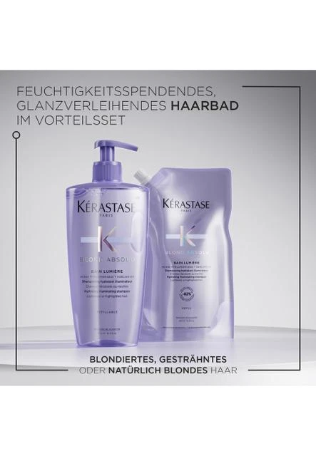 Rechargeable dispenser bottle Blond Absolu Bain Lumiere and refillable packaging for blonde or bleached hair. This kit provides optimal care for blonde hair, helping to maintain its shine and vitality.
