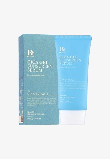 This CICA GEL sunscreen cream with SPF 50 PA++++ is enriched with soothing ingredients and is perfect for daily use. It contains centella asiatica, ideal for soothing irritations and stimulating repair for sensitive skin, along with hyaluronic acid and panthenol for deep hydration. Its lightweight texture leaves no white residue and absorbs quickly without weighing down the skin.