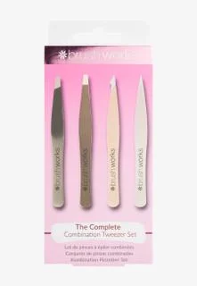 The gold combination tweezers set from Brushworks HD is handcrafted from high-quality stainless steel, offering exceptional performance and precision. It includes angled, straight, slanted-tip, and pointed tweezers, perfect for eyebrow care, false eyelash application, and removing ingrown hairs. PETA certified, cruelty-free, and vegan.