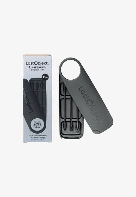 LastSwab Beauty Trio Pro is a makeup tool kit that includes items for removing makeup, blending, correcting mistakes, separating lashes, and shaping eyebrows. The kit comes with a container featuring a large mirror.