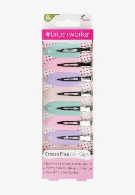 The No Crease hair clips enhance the beauty routine. Designed to keep hair away from the face during skincare, makeup, and styling, they are lightweight and comfortable, suitable for all hair types and textures. They keep hair clean without damaging it or leaving marks. This package contains 8 pastel-colored clips and is PETA certified: not tested on animals and vegan.