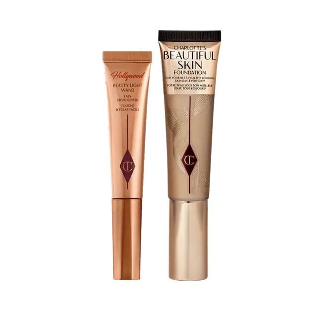 Përfshin fondatinën time të ndërtueshme me mbulim të mesëm për lëkurën tuaj me pamje më të shëndetshme, të hidratuar dhe të BUKUR, fondatinën Charlotte's Beautiful Skin dhe një nga shkopinjtë e mi të dritës së bukurisë më të famshëm në botë!