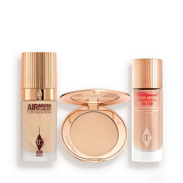 VETËM i disponueshëm në CharlotteTilbury.com dhe në aplikacion, ky kit përfshin formulën time të RE! AIRbrush Flawless Foundation për të krijuar një lëkurë të përsosur dhe pa pore, Filtrin tim Hollywood Flawless për një efekt filtri real dhe pudrën time legjendare, fituese të çmimeve AIRbrush Flawless Finish.
