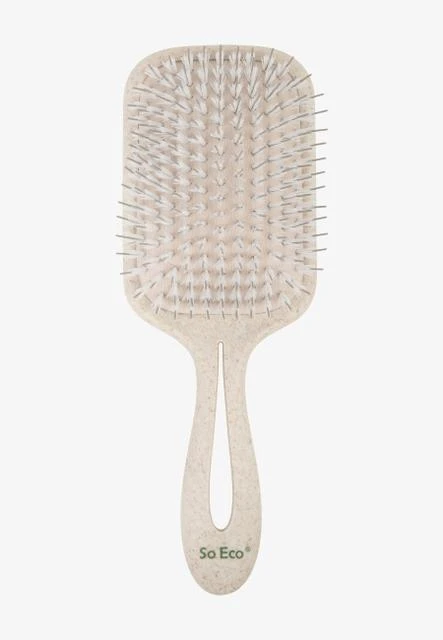 The Eco Paddle Brush is ideal for medium-long hair and extensions. It effectively detangles hair without creating static charges, featuring soft fiber bristles that are gentle on the scalp. With its wide cushioned design and non-slip handle, it eliminates frizz and allows for straight, smooth looks during blow-drying. This must-have brush is a great addition to your hair care routine and is PETA certified, cruelty-free, and vegan.