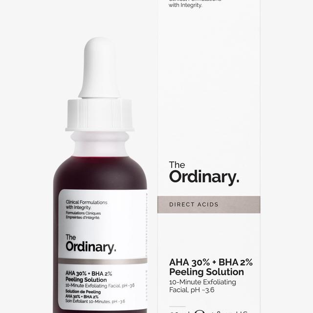 AHA 30% + BHA 2% Zgjidhja e Peelingut eksfolon disa shtresa të lëkurës për një pamje më të ndritshme dhe më të njëtrajtshme. Me ndihmën e acidit alpha-hidroksilik (AHA), acidit beta-hidroksilik (BHA), dhe një përzierjeje derivati nga piperi i Tasmanisë që redukton irritimin, ky peeling për përdorim në shtëpi ndihmon në rrafshimin e teksturës së pazakontë të lëkurës, në çlirimin e poreve të bllokuara dhe në përmirësimin e pigmentimit të parregullt. Formula mbështetet gjithashtu nga një polimer i kalcuar i acidit hialuronik për rehati, pro-vitamina B5 për hidratim dhe karotë të zezë për mbrojtje më të mirë.